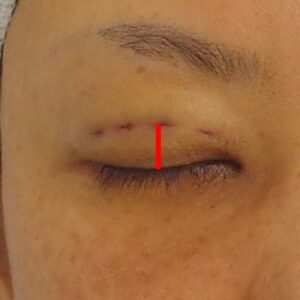 今回のケースも、まつ毛から二重までの距離は10~10.5ミリでした(図の赤のラインの長さ)